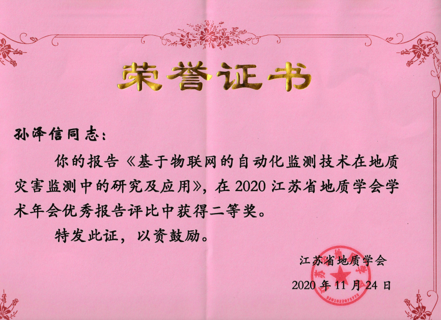 近日,2020江苏省地质学会学术年会在南京召开,孙泽信作为我院科技人员代表在会上以《基于物联网的自动化监测技术在地质灾害检测中的研究及应用》为题作交流发言,并在优秀报告评比中喜获二等奖。